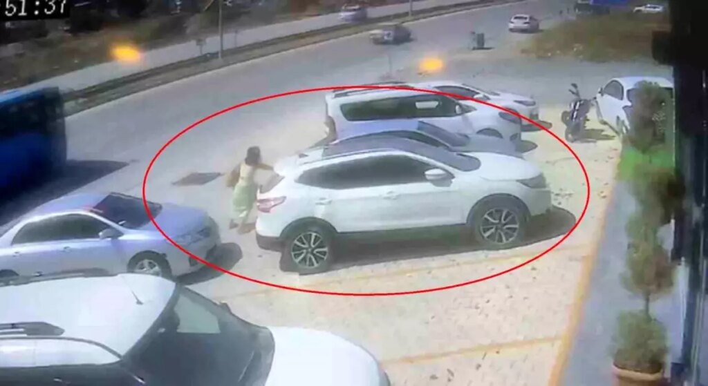 Hatay’da park halindeyken hareket eden aracı kazaya karışmadan tek eliyle durduran bayanın faciayı önlediği anlar kameraya yansıdı.