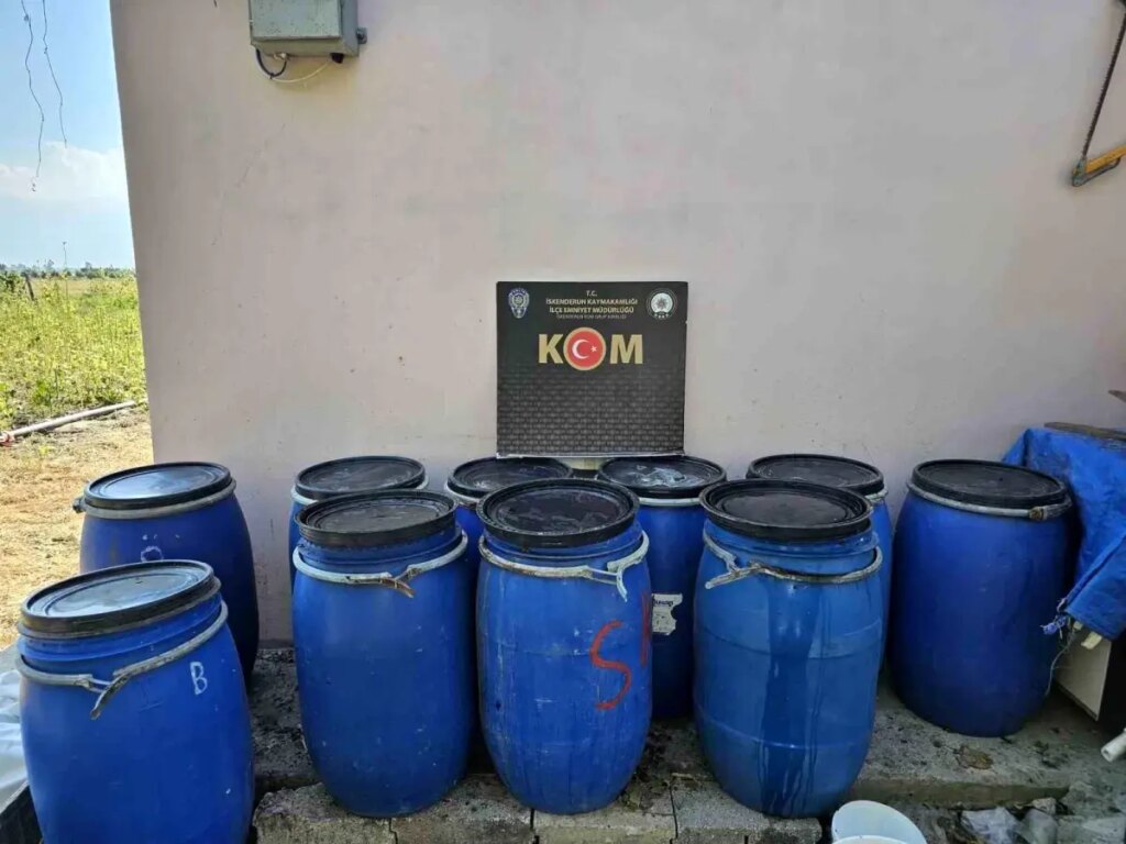 Hatay’ın Arsuz ilçesinde belirlenen 3 adreste yapılan aramada bin 35 litre geçersiz içki ile içki üretiminde kullanılan gereçler ele geçirildi.